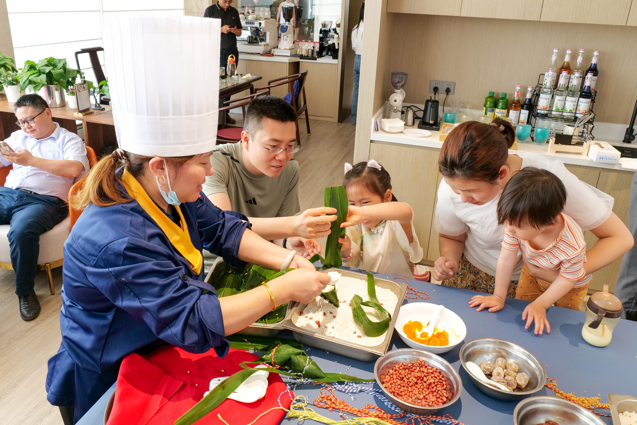 粽子香飘,端午情浓。准备好的食材有红豆、蜜枣、肉、蛋黄,另有粽叶及彩绳,在翰苑大厨的示范教学指导下,大家兴趣盎然,纷纷撸起袖子跃跃欲试,准备一展身手,老人和孩子的兴致也很高,济济一堂,好不热闹,既是学习传统习俗,又是一场愉快有趣的亲子活动。