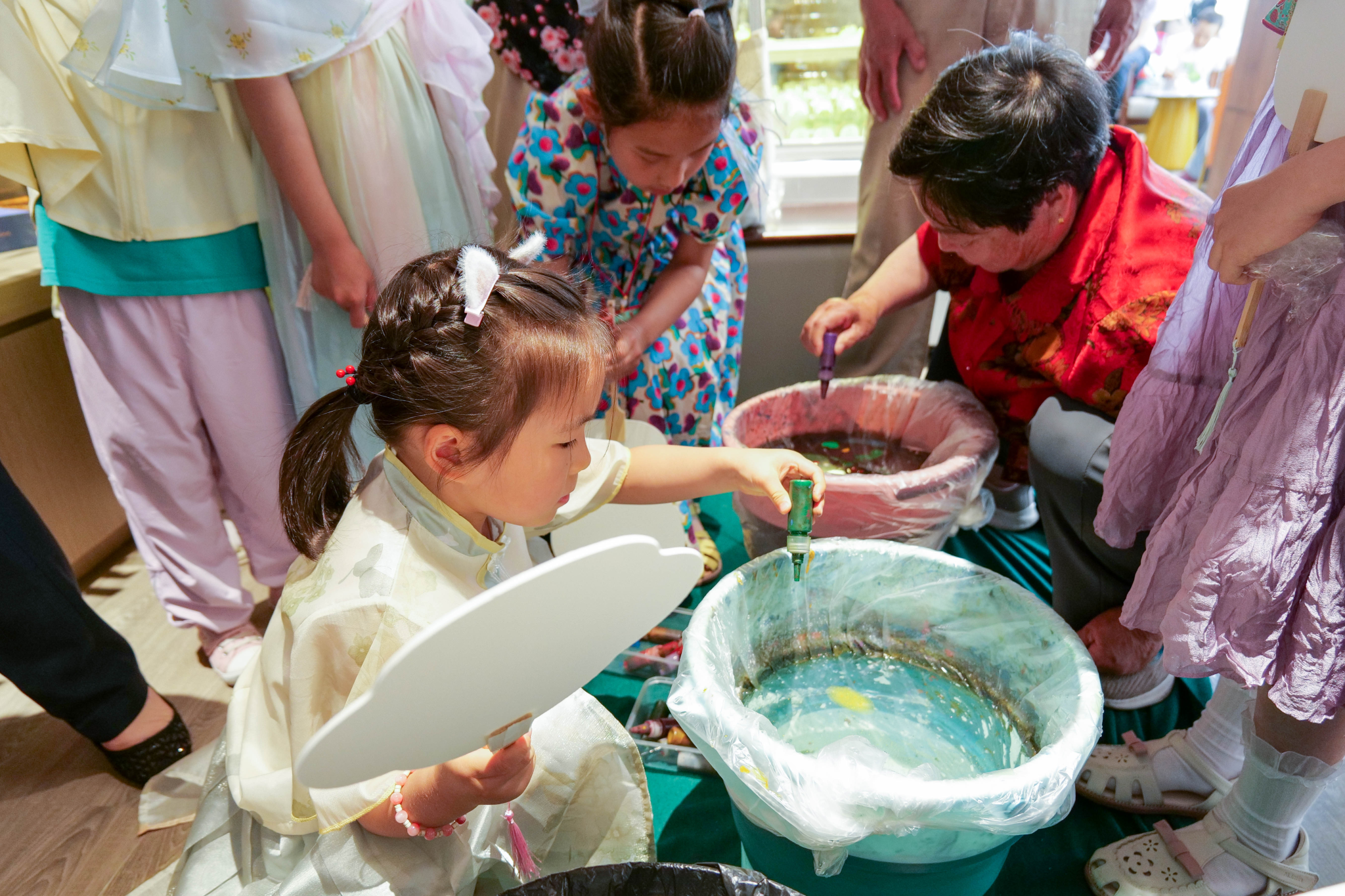 漆扇是以扇子为载体,使用漆艺中的“漂漆”技法,利用了漆不溶于水的特质,形成妙趣横生、自然天成的图案。在翰苑大姐姐的指导下,小朋友每人一把扇子,兴高采烈,自己动手,做出了每一把都是独一无二的漆扇。