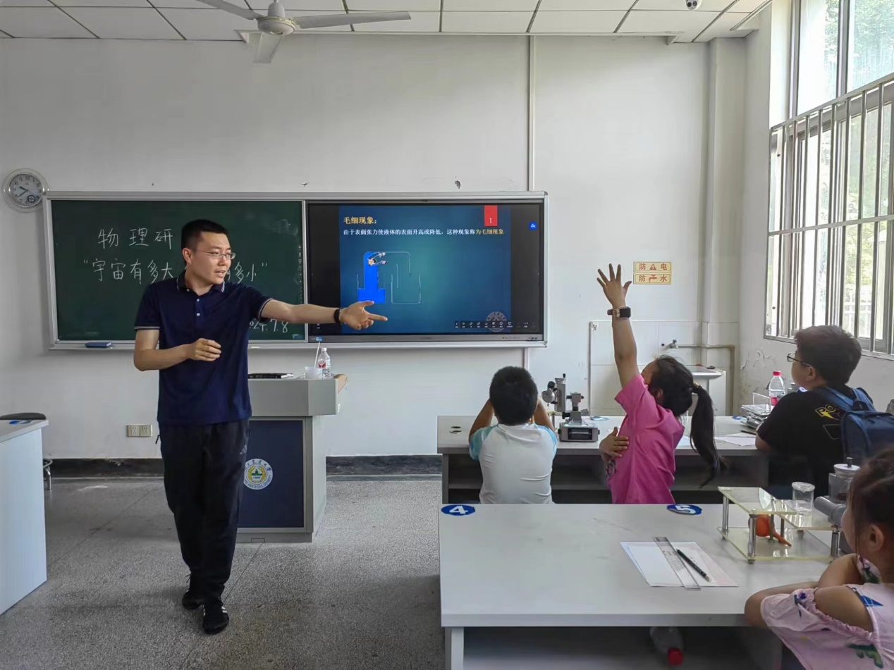 物理系王浩浩老师以“宇宙有多大,物质有多小”为题,由宏观到微观,讲述了世界的尺度。他从生活中常见的毛细现象入手,带领大家完成了毛细管的实验。戴存礼老师则以“探索自然奥秘,点亮科学梦想”为题,给大家介绍了鱼洗的故事,探索了肥皂泡中蕴含的光学现象,让孩子们近距离地体验了静电的存在,并和大家分享了避雷针的原理。葛梦炎老师以“探索光的奥秘:光谱与全息技术的奇妙世界”为题,带大家走进了光学的世界。小朋友们自己动手组装了一套全息投影的小装置。看到影像立体地呈现出来,小朋友们不仅学到了知识,也收获了实践的喜悦。