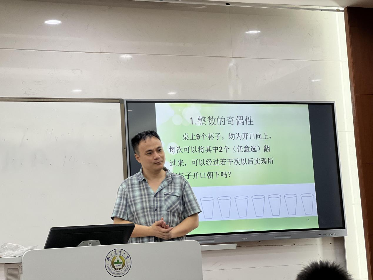 数学系王环宇老师带来了生动有趣的数学课,他提出了一个有趣的问题:“九个开口向上的杯子是否能够通过两两翻转实现全部杯口向下呢?”这引起了小朋友们的积极思考和踊跃回答。王老师还在一个个生动有趣的事例中讲述了奇数偶数及小数分数的概念,培养了小朋友们的数学思维。