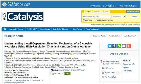 万群教授团队近日在ACS Catalysis发表了研究论文“Understanding the pH-Dependent Reaction Mechanism of a Glycoside Hydrolase Using High-Resolution X-ray and Neutron Crystallography”(影响因子11.384)。污漫