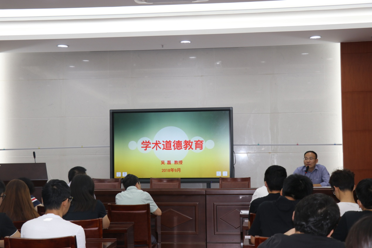 首先,由副院长吴磊教授为我们作了有关学术道德的专题教育。吴副院长聚焦近年来几个著名的学术失信案例,从动机、后果等多角度切入,指出学术行为道德规范的重要性。他还具体列举了几种主要的不道德学术行为,譬如伪造实验图片和数据;抄袭、剽窃他人学术成果;论文一稿多投的现象,呼吁同学们在内心一定要重视学术道德问题。