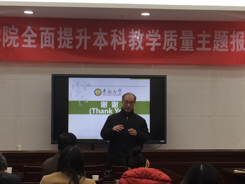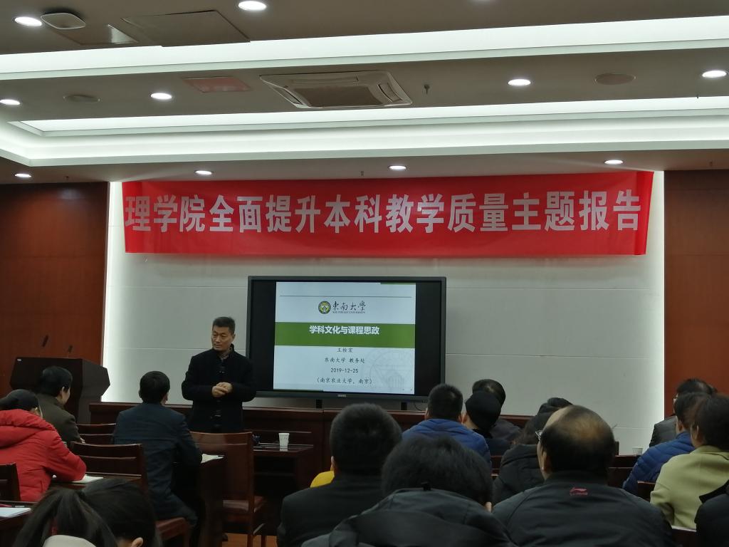 2019年12月25日下午2:30,污漫 教师职业发展助推计划----名师讲堂第二期如期展开。数学系邀请东南大学教务处副处长王栓宏教授做了题为“科学文化与课程思政”的主题报告。报告由污漫 副院长朱映光教授主持,教务处缪副处长,污漫 章维华院长及部分数理化教师参加了报告会。