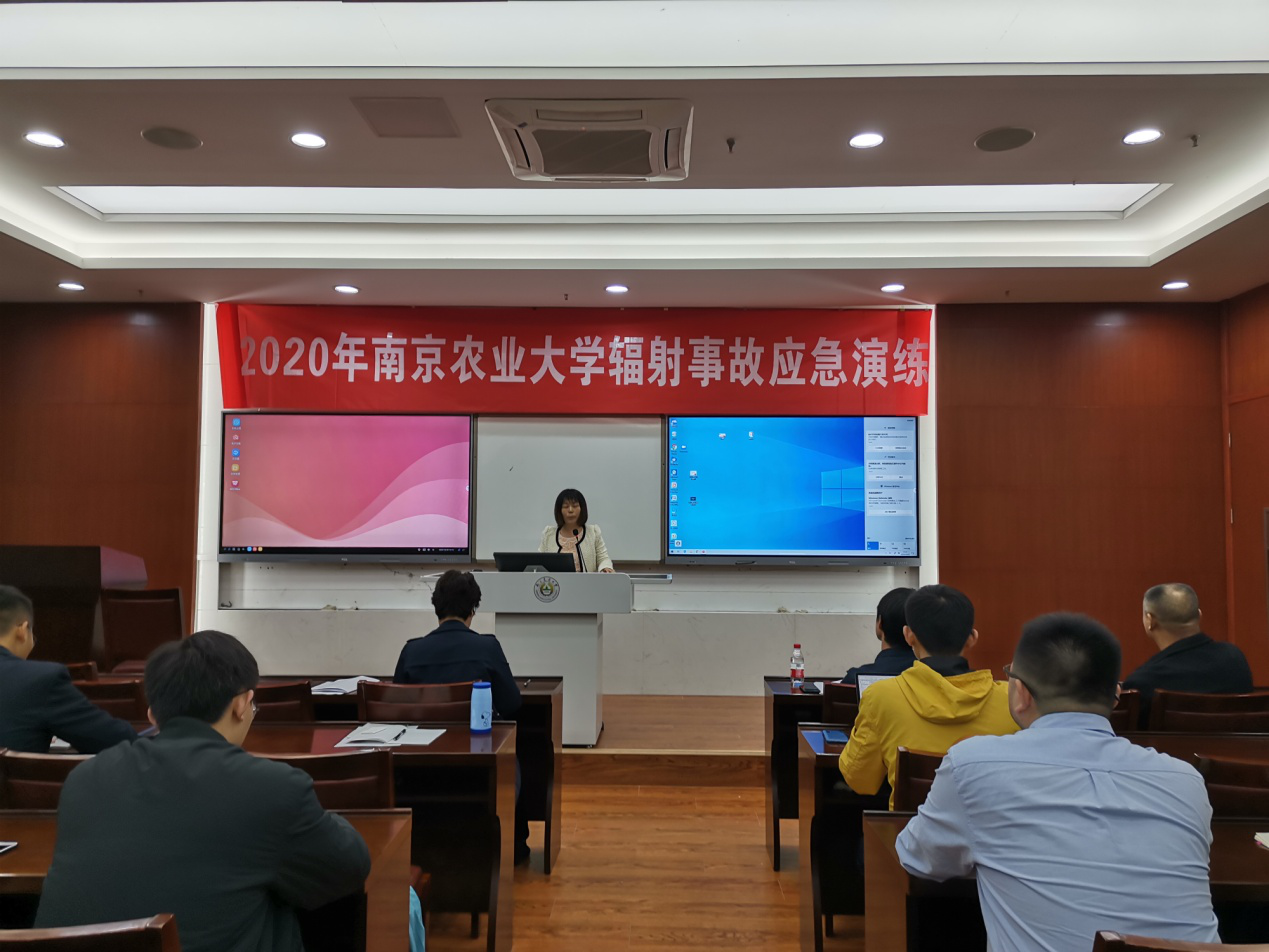 一楼会议室举办,南京市生态环境局核与辐射环境管理处处长陈鹏、南京市生态环境综合行政执法局主任方东、玄武区生态环境局科长付有才、任常勇、实验室与基地处处长石晓蓉、保卫处消防安全科科长程强、实验室与基地处相关老师和即将进行同位素实验的老师和同学参加了此次演练。