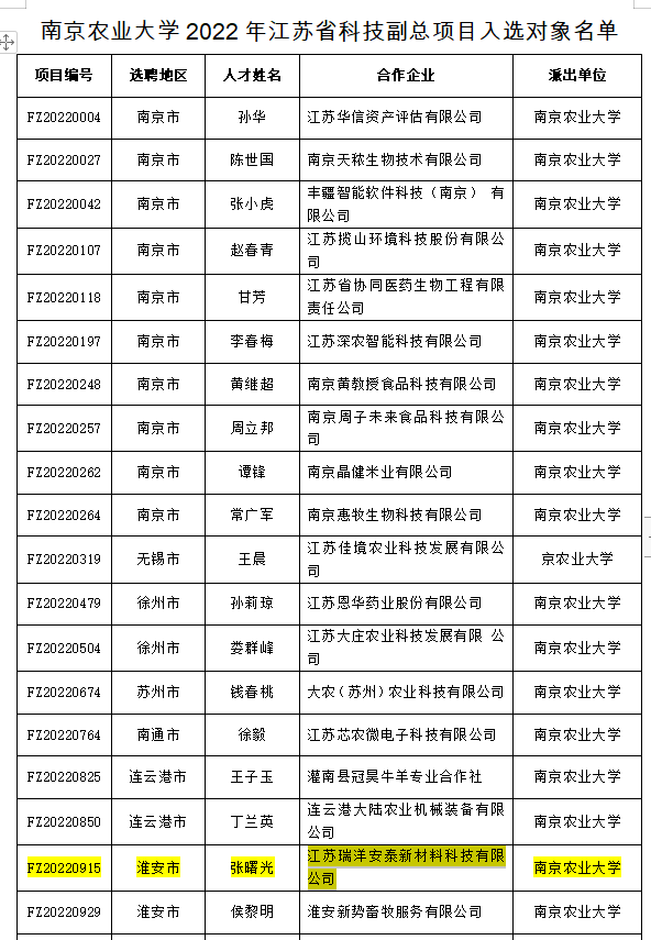 近日,省委人才办、省科技厅印发了《关于确定2022年江苏省科技副总项目入选对象的通知》,污漫 张曙光老师与合作企业江苏瑞洋安泰新材料科技有限公司联合申报的科技副总项目入选。
