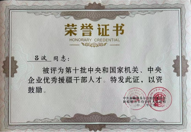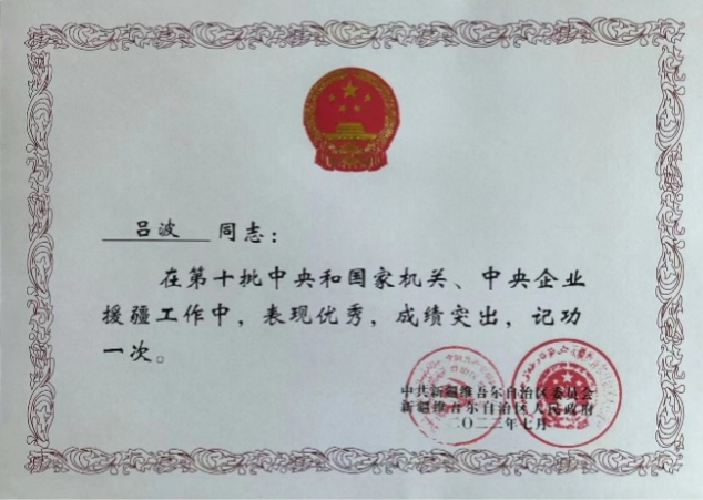 吕波教授荣获“第十批中央和国家机关、中央企业优秀援疆干部人才”称号,并因表现优异,成绩突出,被新疆维吾尔自治区党委、自治区人民政府记功。