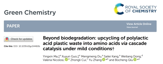邱博诚教授团队在国际著名学术期刊Green Chemistry发表题为:“Beyond biodegradation: upcycling of polylactic acid plastic wastes into amino acids via cascade catalysis under mild conditions”的论文,以废弃的聚乳酸塑料为原料,实现了在温和条件下高效产生高值化学品-丙氨酸。