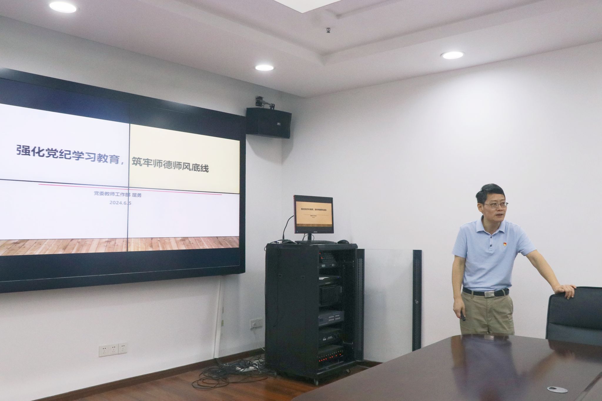 屈勇作题为《强化党纪学习教育,筑牢师德师风底线》的专题辅导报告,围绕深入推进教师党员党纪学习教育和师德教育,对学校党委印发的《关于进一步压实二级单位师德师风主体责任实施办法》进行了详细的解读。报告阐述了学院以及党支部两个二级主体开展教师思想政治和师德师风建设的主要工作内容,并就如何压实学院师德师风主体责任提出了建议,为学院“筑牢底线”和“高线引领”双线推进师德师风建设提供了有力指导。