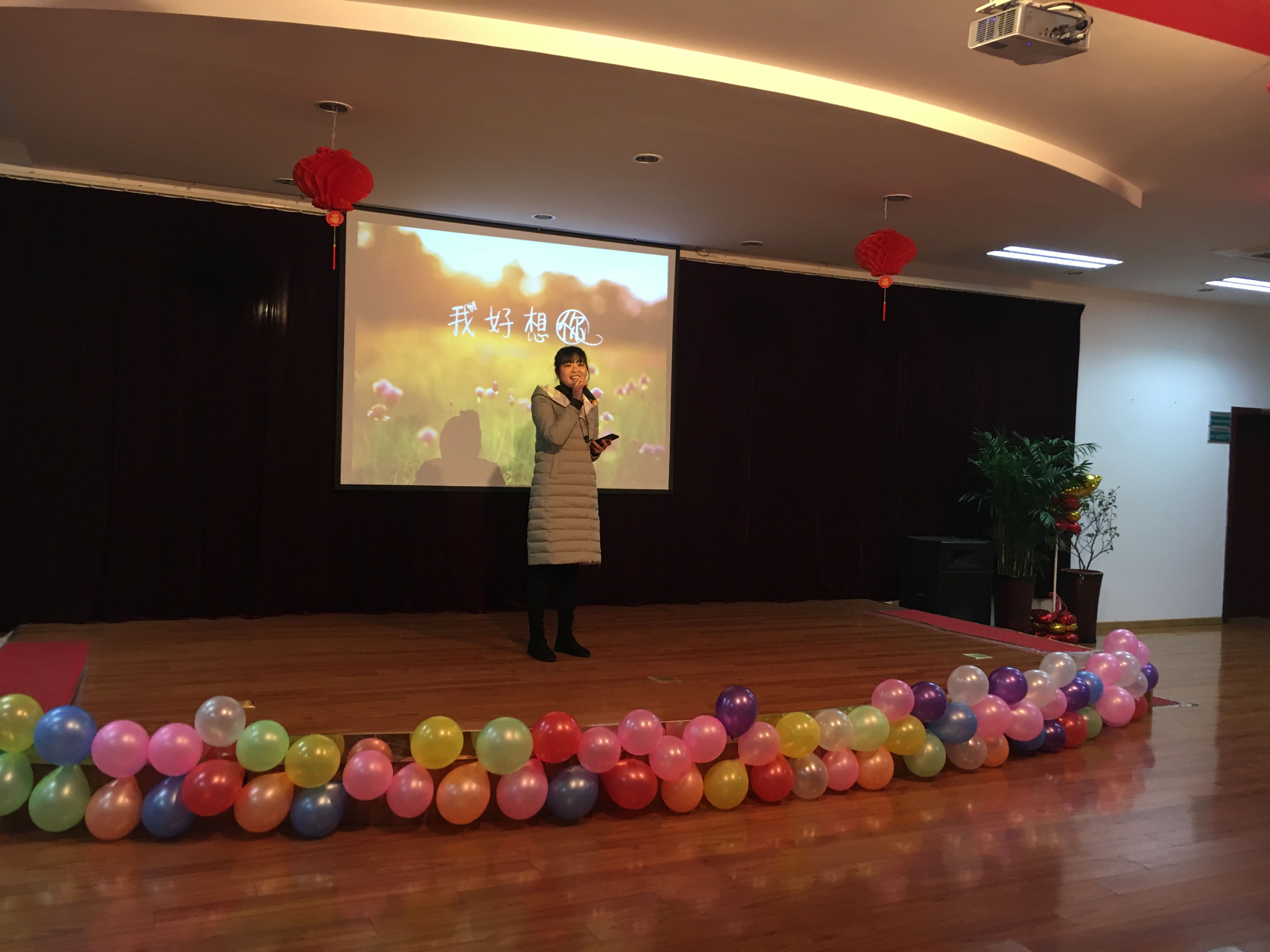 辅导员周玲玉老师登台,演唱了一首歌曲《我好想你》,声音细腻甜美,博得热烈掌声。