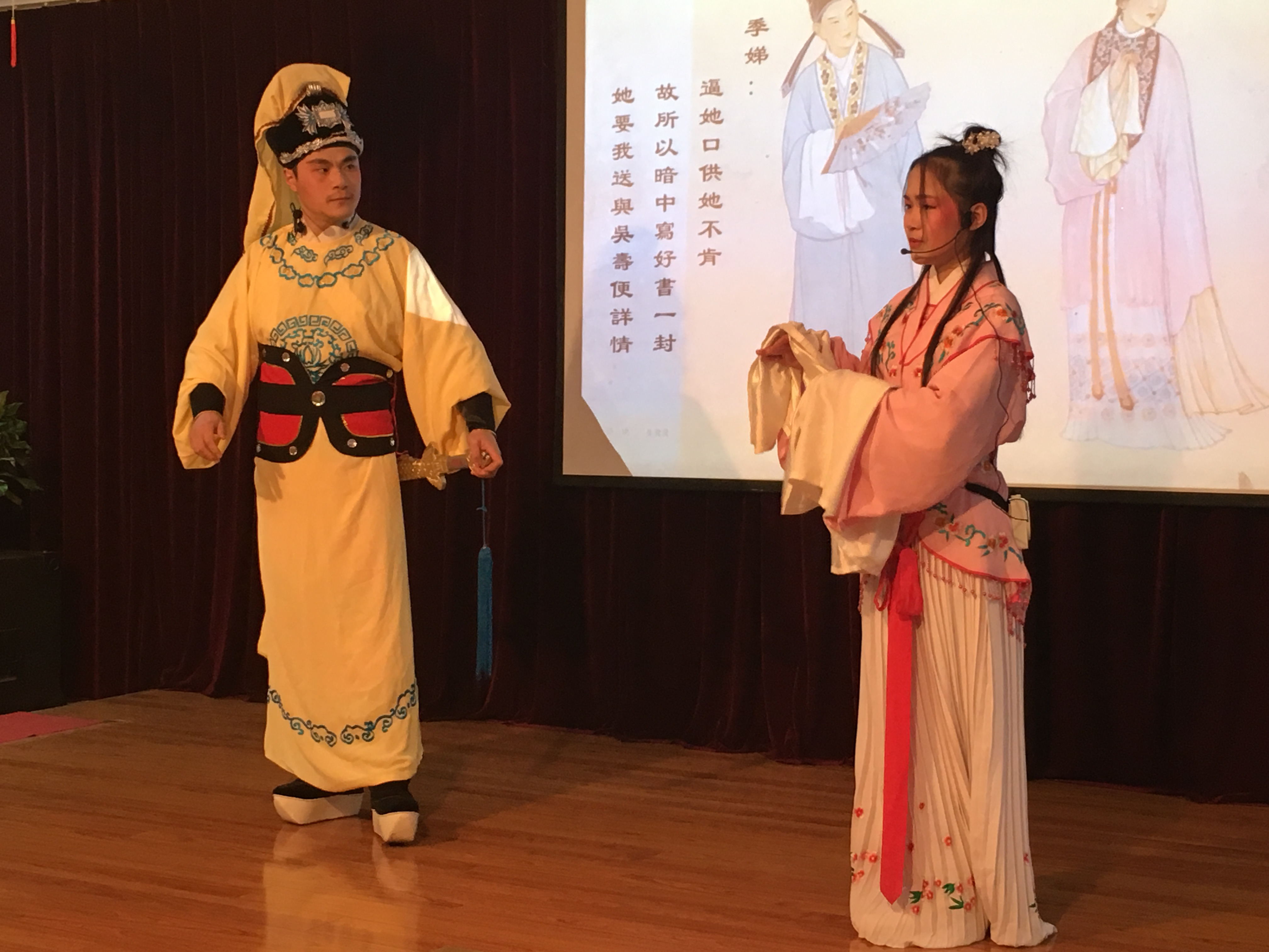 短暂的游戏过后,信科161班的王明辉和魏琉琼的一首歌曲《故乡》将观众们带入了一个坦荡不羁的游子的世界,充满节奏的乐声环绕着整个会场;接下来便是由王环宇老师和信科132的袁爽同学带来的越剧《山河恋》送信片段。