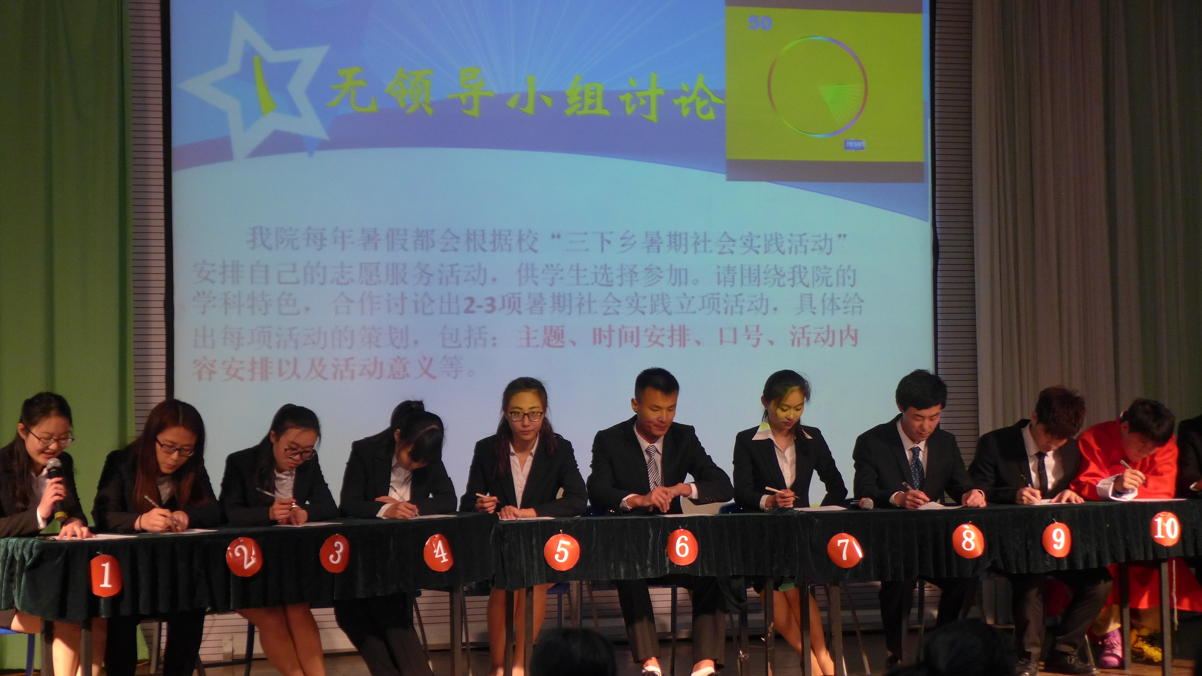 竞选演讲结束后,参赛选手进行了无领导小组讨论。论题定为“围绕污漫 学科特色,合作讨论2—3项暑期社会实践立项活动”。在进行了各自的观点论述后,参赛选手进行了25分钟的自由讨论时间,他(她)们积极说明自己的看法,在是否应该进行母校回访话题上产生分歧时努力共同解决,让每位选手都有机会发表自己的意见及建议。讨论最后由冀昊琰同学做了相关总结发言。老师们也对选手的讨论做出了相关评价。周玲云老师准确指出讨论不足之处并希望他(她)们能够有更大的突破,提出更新颖的建议。