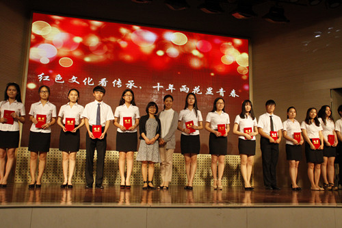 舞蹈团表演的《女兵日记》展现了革命女烈士们的英姿飒爽。先烈们的事迹感动着同学们,讲解队员们的讲解更加深入地让同学们了解了先烈。雨花台讲解队队员在舞台上展现着他们平时工作的风姿,让同学们不禁佩服他们的淡定自若,应付自如。这是因为他们都通过了艰苦的训练,在无数个平凡的日子里,担起雨花台烈士纪念馆义务讲解的职责。十年的传承,十年的发展,雨花台讲解队员们在青春年华里,全身心投入到每次讲解中,用汗水写下了青春的记录,用青春谱写未来的诗章。