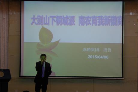 企业管理专业的优秀毕业生,如今也是优秀新徽商之一。在段哲校友所作报告中,他反复地告诉大家自己是南农人,是安徽人,并语重心长地强调作为南农学子不要忘记自己的根,要自信地告诉别人自己是南农人。在作报告的过程中,段哲校友骄傲的介绍了自己的故乡及故乡的桐城派对他产生的积极影响,是大别山下的桐城派和徽商成就了现在有着良好文笔和商业能力的他。紧接着段哲校友与同学们分享了他在南农学习期间的创业经历以及毕业离开校园后的闯荡经历,并且详细地介绍了求精集团成立并壮大的过程。从始至终,段哲校友都意在告诉同学们“人生在世要有一技之长”和“心有多大,舞台就有多大”这样的人生启示。