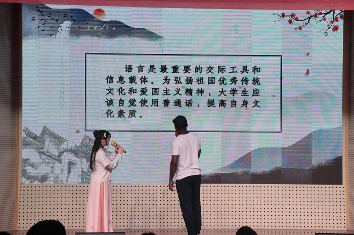 决赛分为小组朗诵,即兴演讲和国语传诵三个环节。首先每4位选手为一组进行集体朗诵,之后按照选手号码序号进行组内选手个人的即兴演讲与国语传颂环节。在即兴演讲中选手当场抽取演讲主题,并且思考作答。在国语传诵中,选手任意抽取一段文字,现场教外国友人朗读。第一组选手为我们带来的《家国叹》,不禁让人感慨,心中有家,胸中有国,家国是我们永远的牵挂。第二组选手带来的是《读中国》,观众们纷纷感叹中国就像一本书,既有源远流长的历史,也有辽阔无垠的土地,仿佛愿用一生去品味。第三组同学带来《写给未来的你》,第四组带来《美丽南农,梦在远方》,带领观众展望未来,感恩母校。在最后的才艺展示环节,四组选手分别带来歌曲表演《大鱼》、小品《快与慢》、《歌舞青春》、《知否知否》,为观众带来一场视听盛宴。
