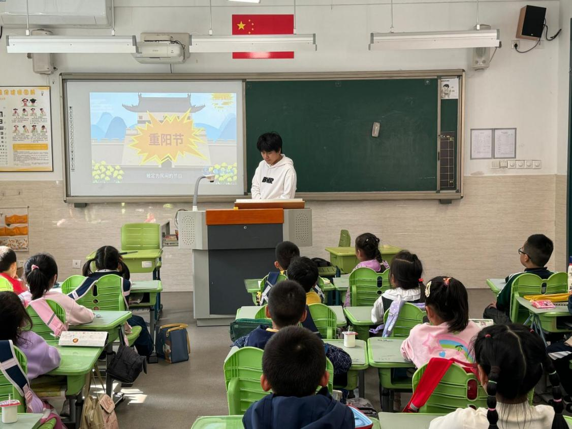 首先,志愿者播放了一段趣味视频,初步介绍了重阳节。同学们全神贯注地观看,积极回答视频后的问题,现场氛围欢快轻松。接着,志愿者详细讲解了重阳节的历史来源与风俗习惯,同学们听得津津有味,纷纷举手分享吃过的重阳节美食,场面其乐融融。互动中,同学们不仅加深了对重阳节的了解,还感受到了传统文化的魅力。