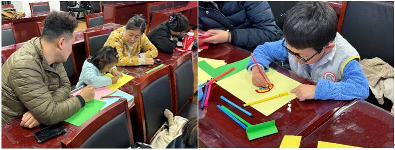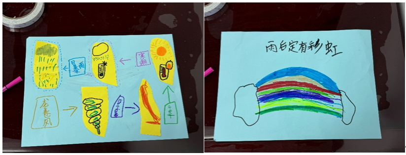 在接下来的游戏环节中,志愿者们拿出了画纸和彩笔,鼓励小朋友们发挥自己的想象力,来绘出他们心中的自然灾害预警标志或灾害发生时所产生的危害。孩子们的无限创意,让每一幅画作都充满了想象力和创造性。画完后,小朋友们也轮流上台,向大家展示并讲解他们的画作。