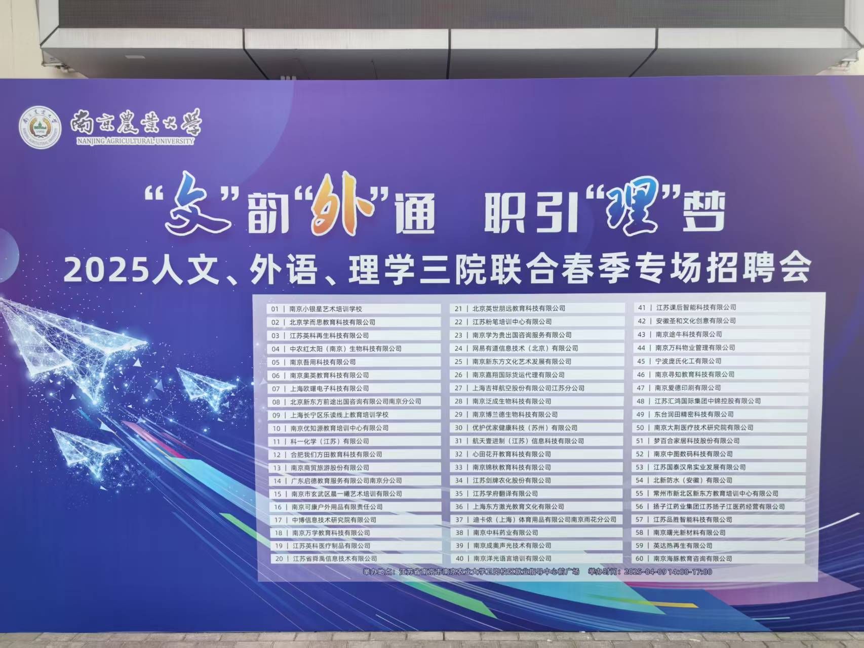 本场招聘会共邀请了60家企业,包括中农红太阳(南京)生物科技有限公司、网易有道信息技术(北京)有限公司、南京新东方文化艺术发展有限公司、南京中科药业有限公司、南京途牛科技有限公司等,覆盖领域包括国际业务、数据分析、供应链、跨境电商、文化教育等方面,为即将毕业步入社会的学生们提供了丰富多元的就业机会。受邀企业通过此次招聘会,广纳贤才,为企业发展增添新生力量。