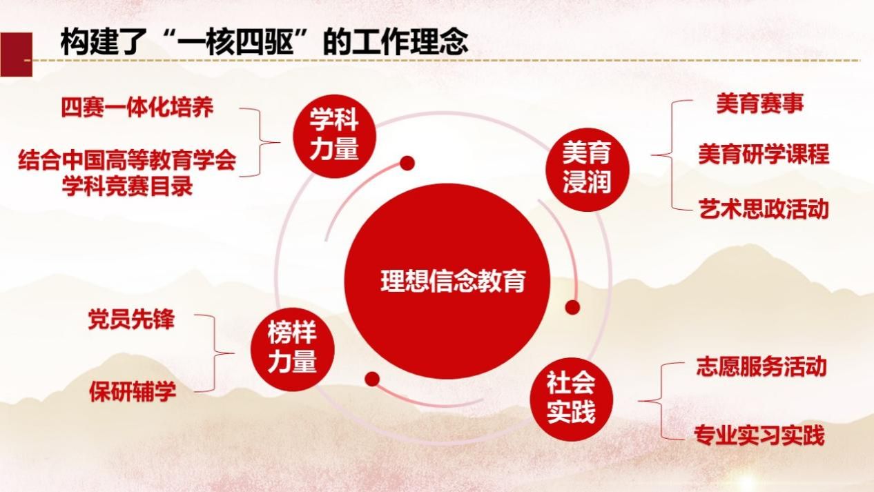 构建了“一核四驱”的工作理念,旨在多维度提升学生的综合素质,探索出一套独具特色的人才培养模式。 “一核四驱”以理想信念教育为核心,以美育浸润、社会实践、学科力量、榜样力量为四个驱动方向,全方位助力学生成长,为社会培养更多德才兼备的高素质人才。