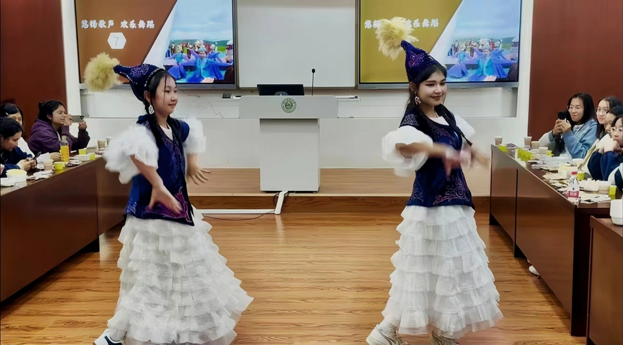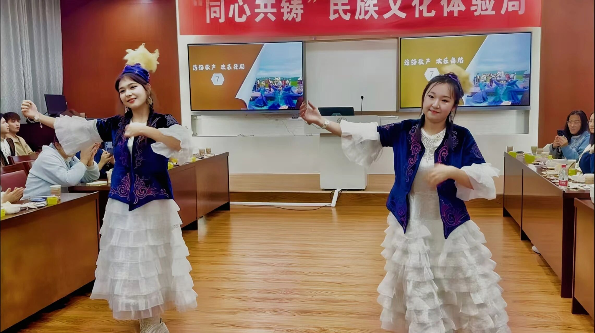 巴合达娜和乎丽卡尔同学表演了传统哈萨克族舞蹈,灵动的舞步展现了草原民族的热情与柔美,将现场气氛推向高潮。