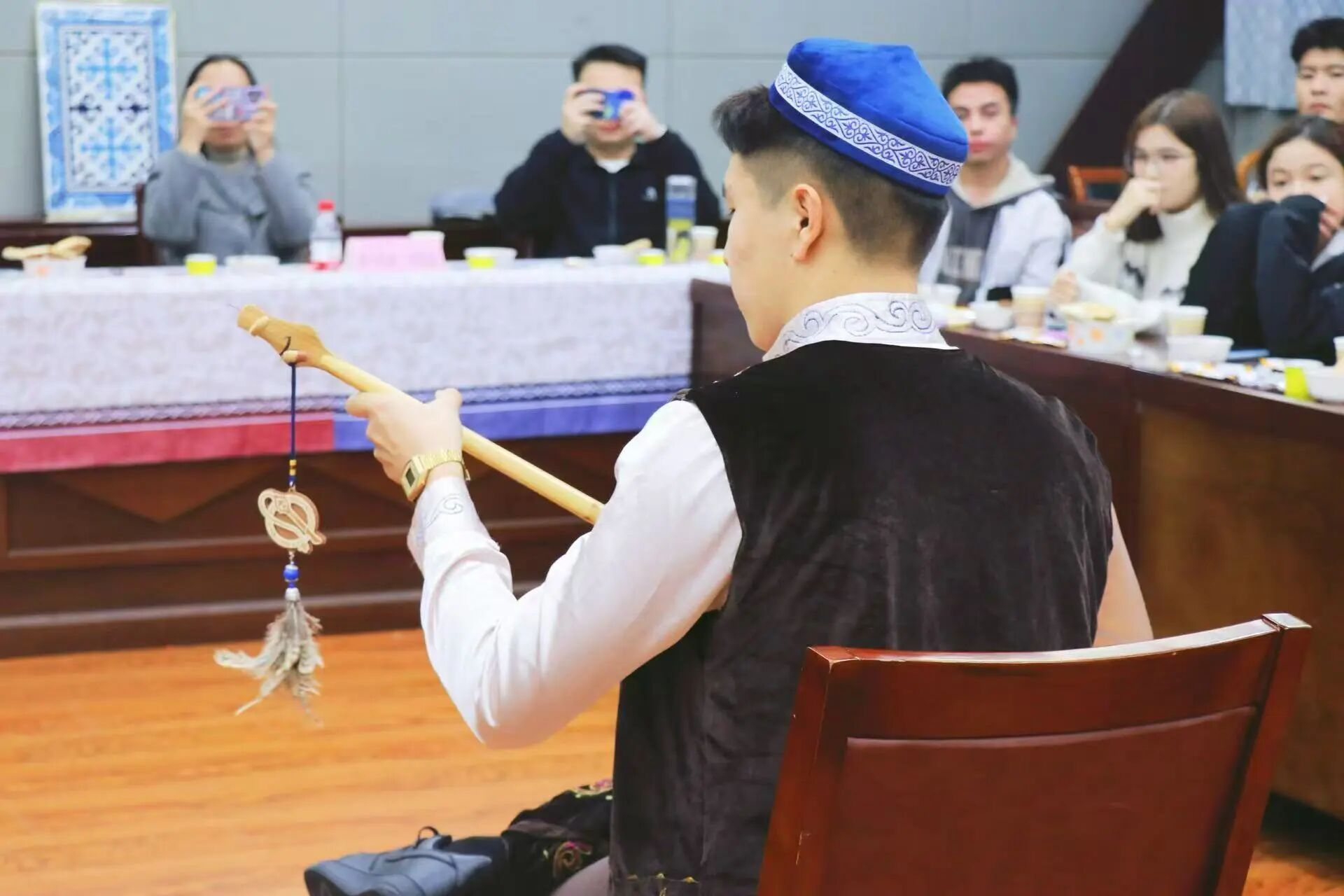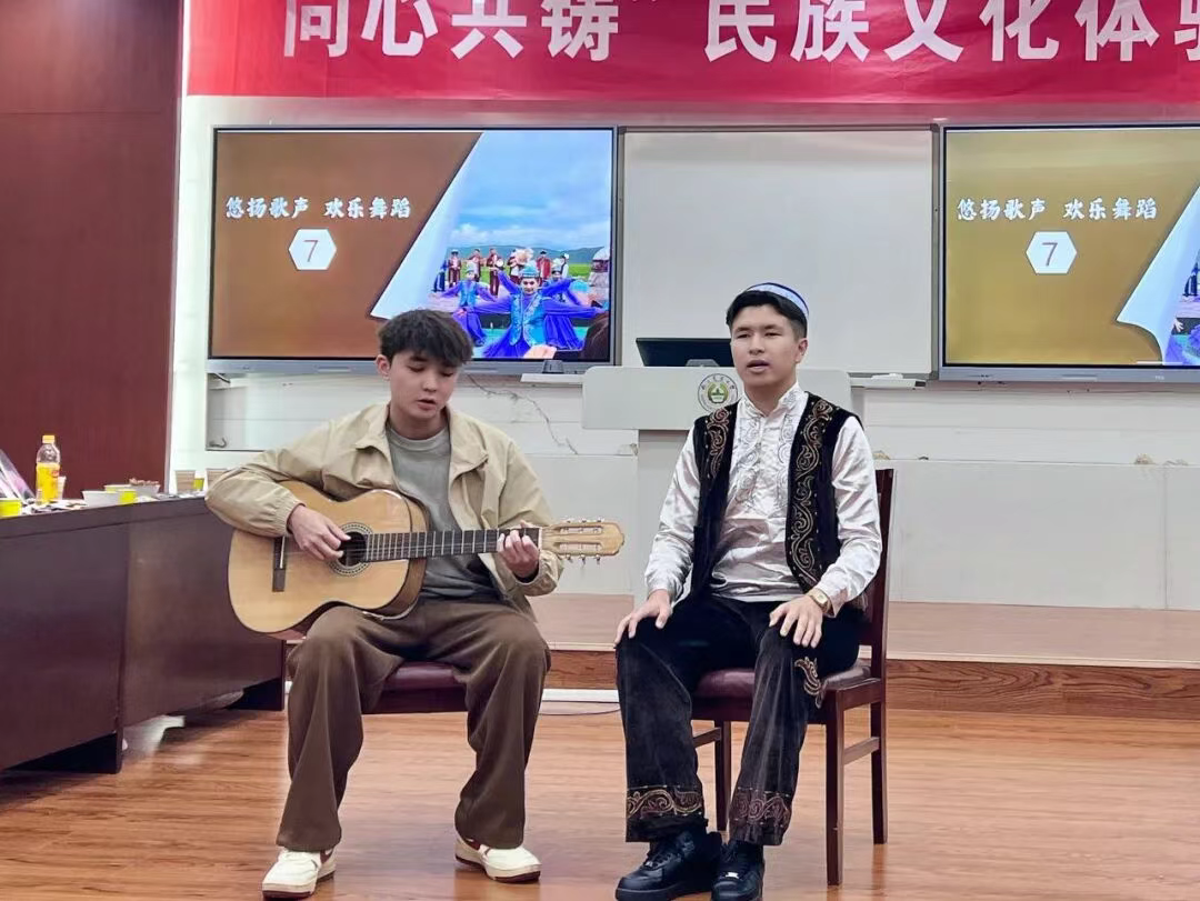 随后,哈萨克族木那尔和吾斯铁木同学带来了深情的民歌演唱,冬不拉悠扬的琴声仿佛把大家带到了天山脚下的大草原。