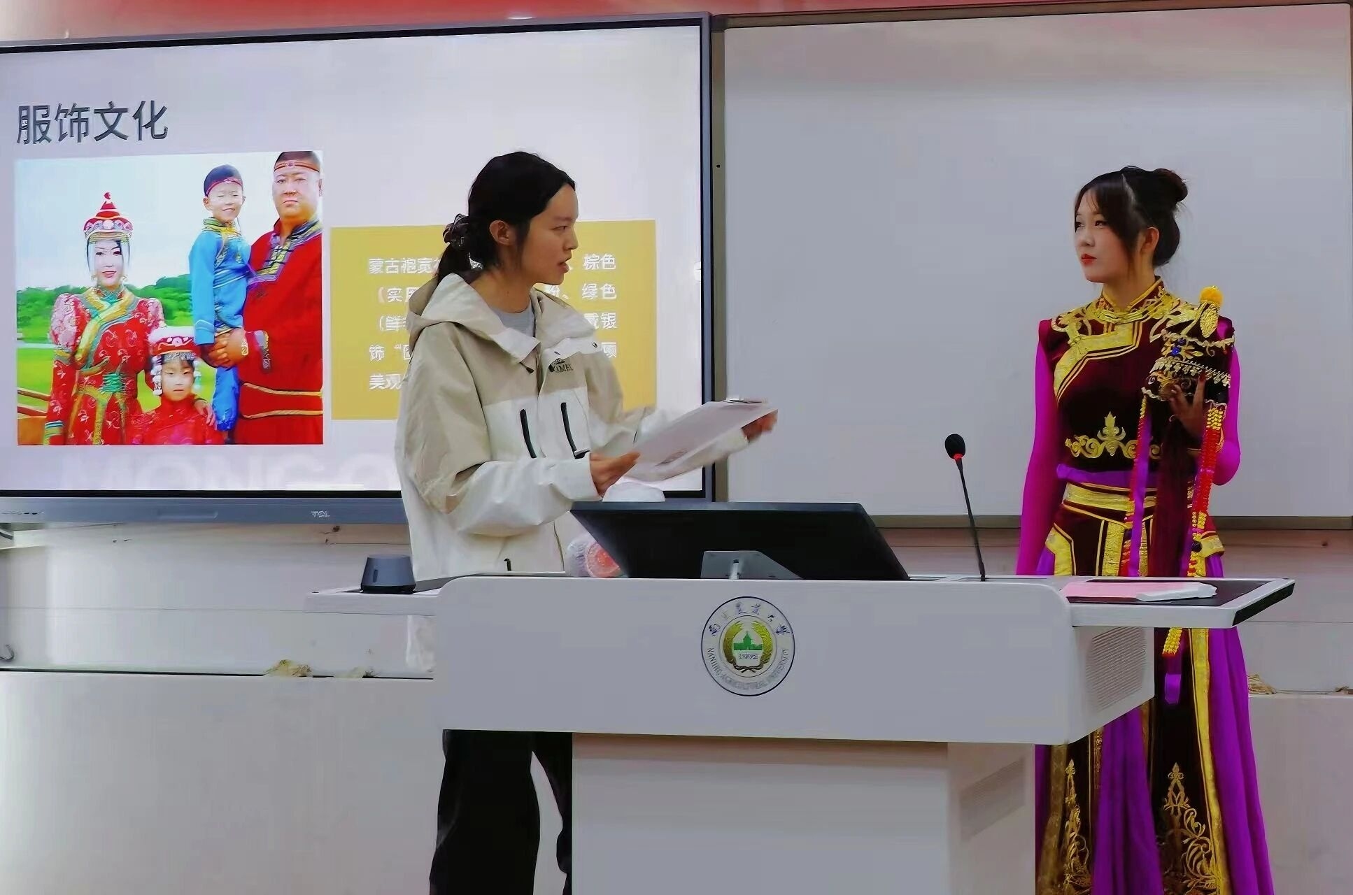 蒙古族同学宗芮彤身着传统服装,生动介绍了草原民族的游牧生活、传统节日和体育竞技。他们讲述了那达慕大会的热血情怀,展示了蒙古族男儿的豪迈气魄和女性的柔美大方。