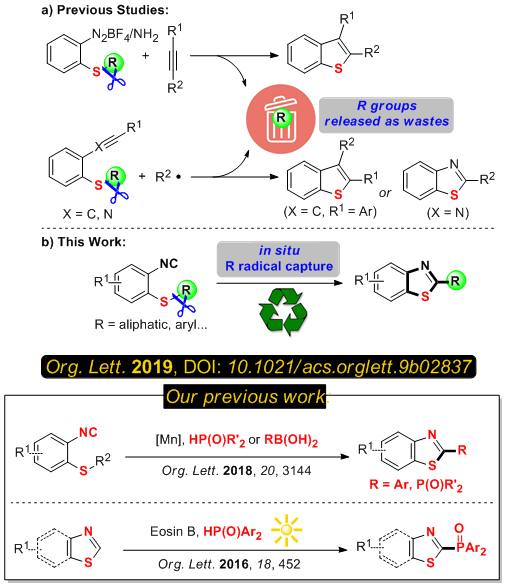 苯并噻唑和苯并噻吩是很多药物分子和功能材料的核心骨架,也是有机合成和药物合成的重要中间体,因此其高效合成方法引起近年来化学研究工作者的广泛关注。已有文献报道中,芳基硫醚(R=甲基,苄基,苯基)的自由基切断提供了苯并噻唑和苯并噻吩多样的合成方法,然而这些研究均牺牲了原子经济性(如图)。
