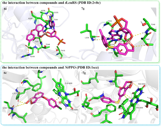 为了评估这些化合物对非靶标植物的影响,研究团队还进行了阴性对照实验。结果显示,化合物6c在不同浓度下对黄瓜的生长没有显著影响,初步证实了其对非感染植物的安全性。研究团队通过分子对接和酶活性测定实验,进一步揭示了高活性化合物对LeuRS和PPO的作用效果和机制。此次研究表明二苯(硫)醚苯并硼唑衍生物具有高杀菌活性、高除草活性、高安全性,是双靶标农药创制的潜在结构。该系列研究在持续推进中。